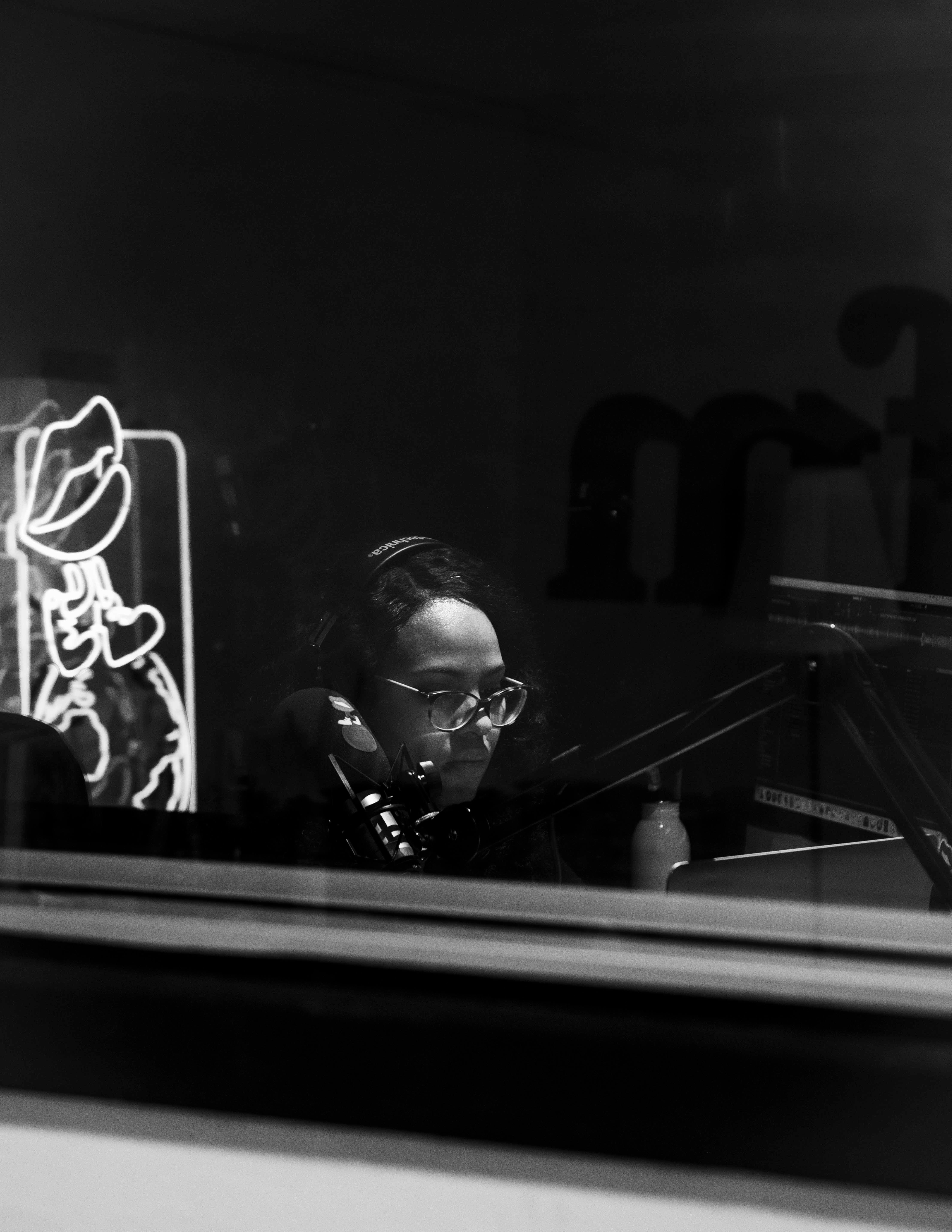 Polaroids of all those who have appeared on the station are spread across the coffee table, and a rack of merchandise stands in the corner. A huge neon Foundation FM sign is reflected in the window of a professional studio where DJ Kamilla Rose (Boiler Room, BBC Radio 1Xtra) is in the middle of her daily show.